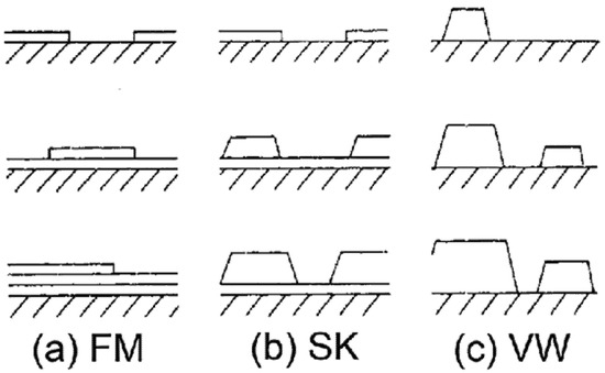 Thin film growth modes represent a compact taxonomy that connects interfacial thermodynamics and surface kinetics with the macroscopic morphology that develops during the deposition process. Understanding them is important as they set the initial route for grain structure, roughness evolution, and defect incorporation within functional films [3]. The traditional categorization of growth as either Volmer–Weber (island), Frank–van der Merwe (layer-by-layer), Stranski–Krastanov (layers + islands), and step flow growth is more than historical names; they capture the balance of energies between film–film, film–substrate, and the substrate surface energies with strain and kinetic limits [35]. When it comes to applied practice, this taxonomy takes on a practical design ability in that changing substrate chemistry, temperature, flux, or surfactant additions could shift a system from one regime to another and thereby tune electronic, optical, or mechanical performance without changing bulk composition [36]. The morphological evolution of epitaxial thin films is fundamentally determined by the balance between the surface and interfacial free energies of the film–substrate system. Depending on these competing energetics, adatom–substrate and adatom–adatom interactions lead to distinct growth regimes that dictate whether the film develops in two dimensions or transitions into three-dimensional island structures. As illustrated in Figure 2, epitaxial growth can proceed through the Frank–van der Merwe (FM), Stranski–Krastanov (SK), or Volmer–Weber (VW) modes.