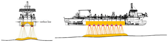 where represents the sand discharge rate (per unit time), represents the effective dispersion width, represents the vessel casting speed, represents the duration of a single pass, and represents the bulk density of the deposited sediment.