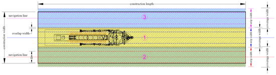 To improve spatial coverage efficiency and thickness uniformity during the TSHD backfilling, the construction area is partitioned into parallel strips. Using the principal longitudinal axis of the site as a reference, strips are aligned parallel to this axis (Figure 2). The width of each strip depends on the effective sand coverage width of the TSHD (ws) and the required overlap width between adjacent strips (wc) to avoid edge underfill and weak zones. The actual strip spacing is as follows: