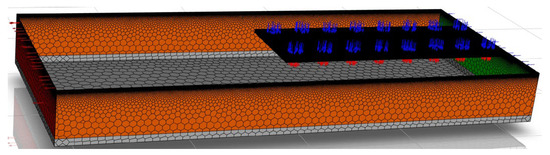 The fluid and solid regions in the model are discretized using a nonuniform hexahedral mesh with local refinement in the bottom door jet region, the near-bed deposition zone, and along the free surface, while a gradually coarsened grid is adopted farther away from these dynamically active areas to reduce the overall cell count. This mesh layout ensures the adequate resolution of the jet, plume, and deposition processes within an acceptable computational cost. The resulting mesh distribution and locally refined regions are shown in Figure 5.