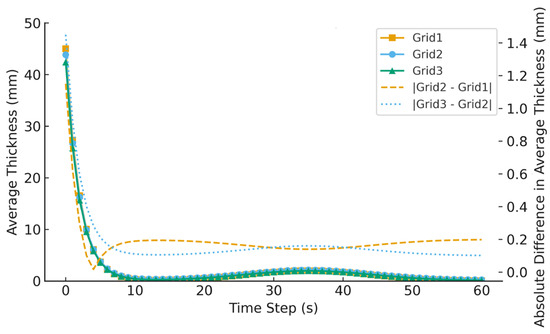 Using nonuniform hexahedral meshes with local refinement around the bottom door jet region, the near-bed deposition zone, and the free surface, and gradually relaxed spacing in the far field, three structured grids were tested. For a representative case with an ambient current of 0.3 m/s, a vessel speed of 0.045 kn, and a 50% door opening, Figure 6 presents the temporal evolution of the domain-averaged backfill thickness for the three grids. All curves exhibit a consistent key response pattern, namely, a rapid rise to an early peak followed by decay towards a quasi-steady layer thickness, and the thickness remains strictly non-negative throughout. The auxiliary axis in Figure 6 shows the instantaneous absolute differences in average thickness between successive grids, indicating that the deviations of the coarser grids are modest: refinement from Grid1 to Grid2 already reduces the relative error to below 3%, while further refinement to Grid3 (5.3 × 104) decreases the discrepancies to below 2%. Additional refinement yields only marginal improvement at the cost of a marked increase in computational time. Balancing accuracy and efficiency, Grid2 is therefore adopted as the engineering-optimal mesh for all subsequent simulations.