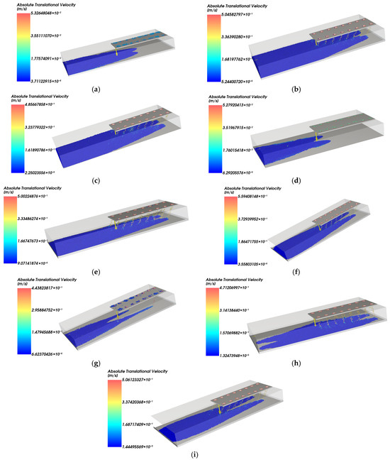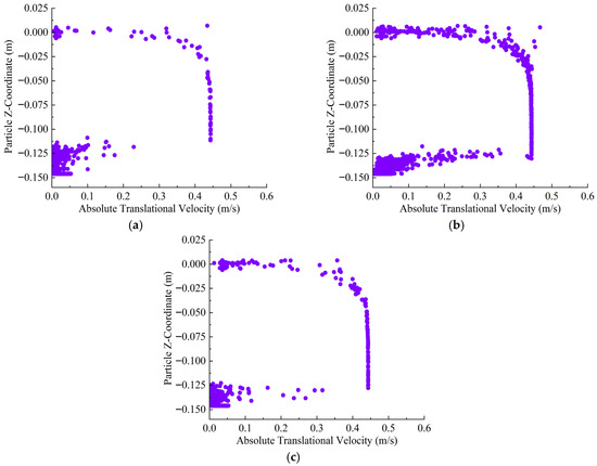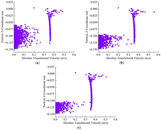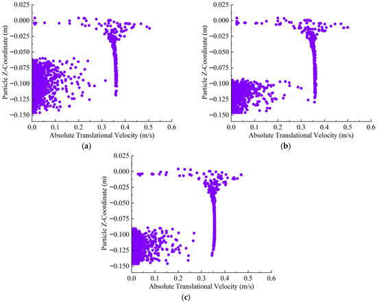 Under the 22% opening condition, the majority of particles settle near z = −0.14 m, with the horizontal velocity primarily distributed below 0.10 m/s and a relatively narrow main settling band. However, the low discharge flux and limited dispersion cause a strong contrast between the dense core and the very thin surrounding areas; at the footprint scale, this translates into pronounced thickness differences and a large uniformity index, i.e., poor areal uniformity despite the apparently compact settling band. As the vessel speed increases, some particles experience a slight increase in velocity, but the position of the main settling layer remains unchanged, and only a small number of outliers appear, as shown in Figure 7.