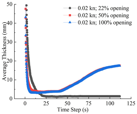 During the 10–30-s period, the sediment is subjected to the spreading effects of water flow, and the average thickness rapidly decreases. For instance, with a 22% opening in the forward condition, the thickness drops from 0.16 m to approximately 0.01 m, a reduction of over 93%. In this phase, the sediment undergoes widespread diffusion and uniform distribution. After 30 s, the thickness gradually stabilizes. Data show significant differences in the final thickness under different conditions: approximately 0.004 m for the 22% opening, 0.021 m for the 100% opening, and 0.02 m for the 50% side opening.