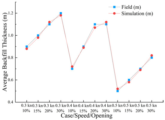 As shown in Table 7, the field backfilling tests on soft soil foundations mainly adopt vessel speeds of 0.3–0.5 kn with bottom door openings of 20–30%, which lie within the 0.2–0.7 kn operational window defined for the numerical parameter matrix. This consistency indicates that the simulated parameter space is representative of actual TSHD backfilling practice and directly supports the engineering relevance of the recommended parameter ranges. The on-site construction results indicate that, under different vessel speeds and bottom door openings, the average effective backfill volume percentage is 92%, showing good results. The average backfill thickness ranges from 0.5 m to 1.2 m, and multiple combinations meet the construction requirements. Specifically, when the vessel speed is 0.3 kn, bottom door openings of 10% and 15%; when the vessel speed is 0.4 kn, bottom door openings of 10% and 15%; and when the vessel speed is 0.5 kn, bottom door openings of 20% and 30% can effectively meet the construction requirements.