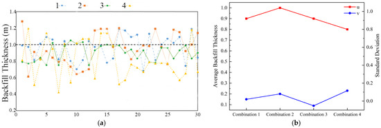 As indicated by Figure 15b, Combinations 1 and 3 both have an average backfill thickness of 0.9 m. The standard deviations for these combinations are 0.09 and 0.15, respectively, with Combination 3 performing better due to its smaller data dispersion and fewer points with a backfill thickness greater than 1 m.