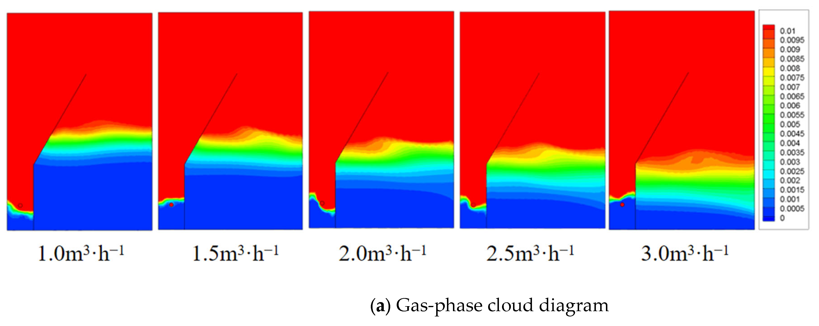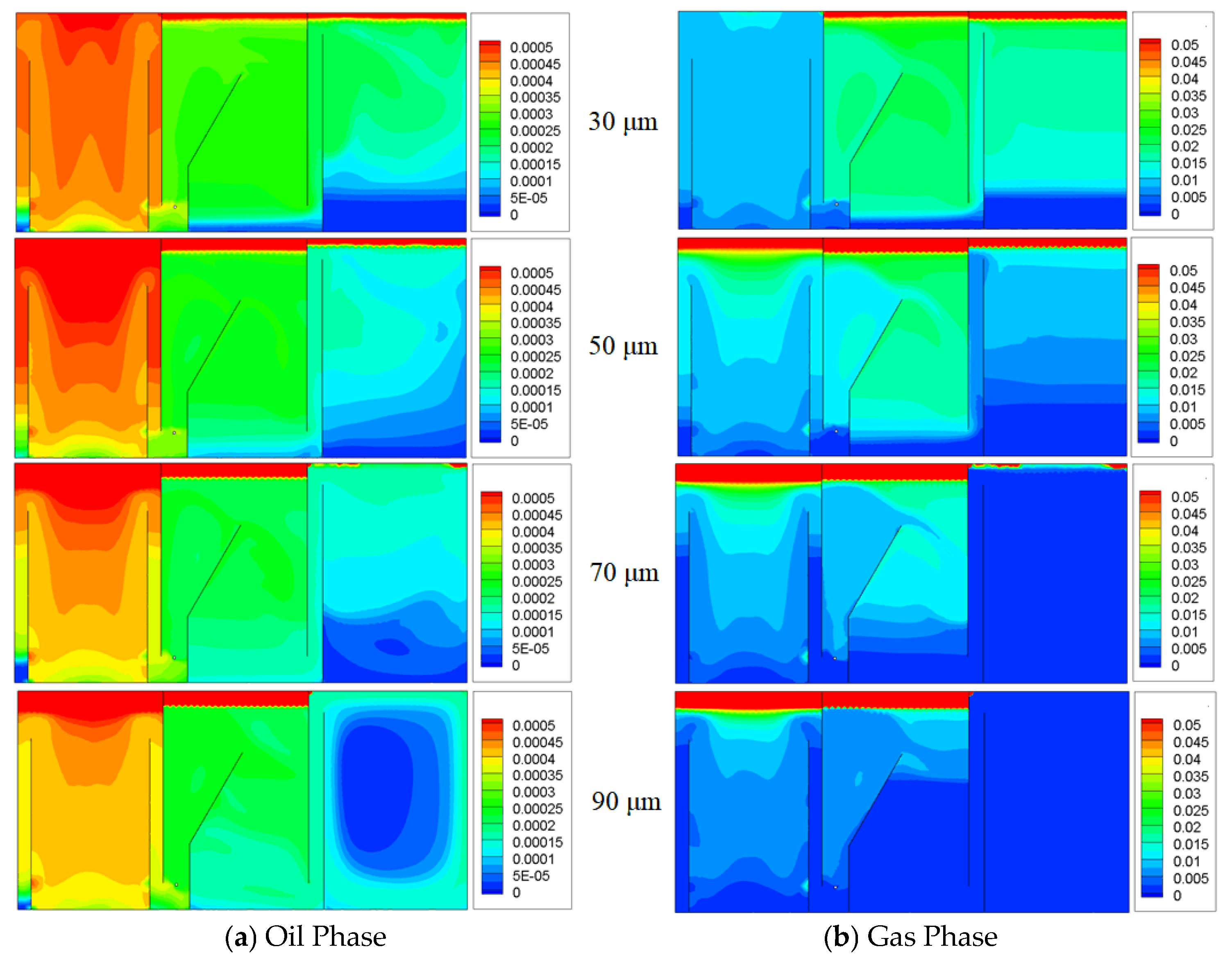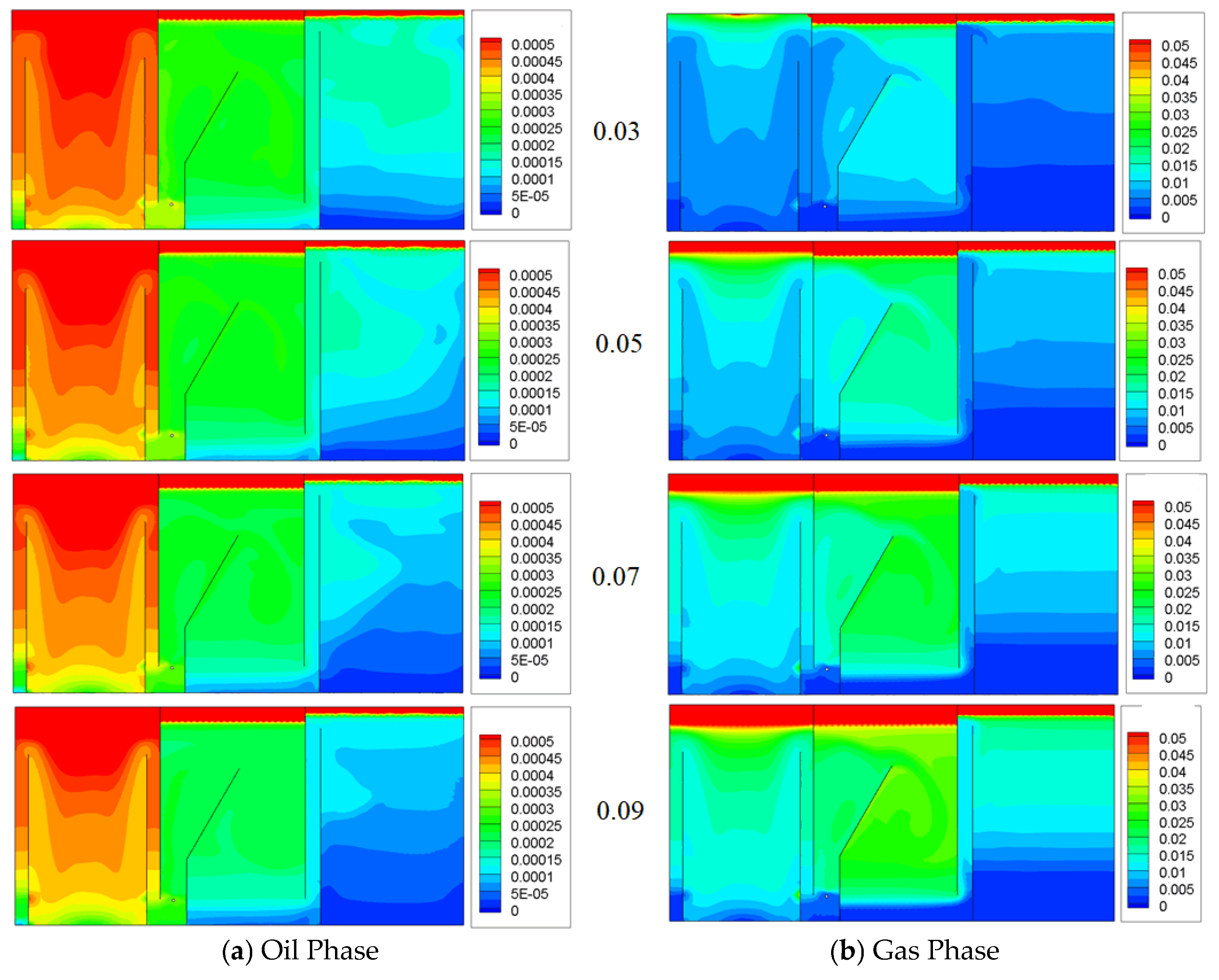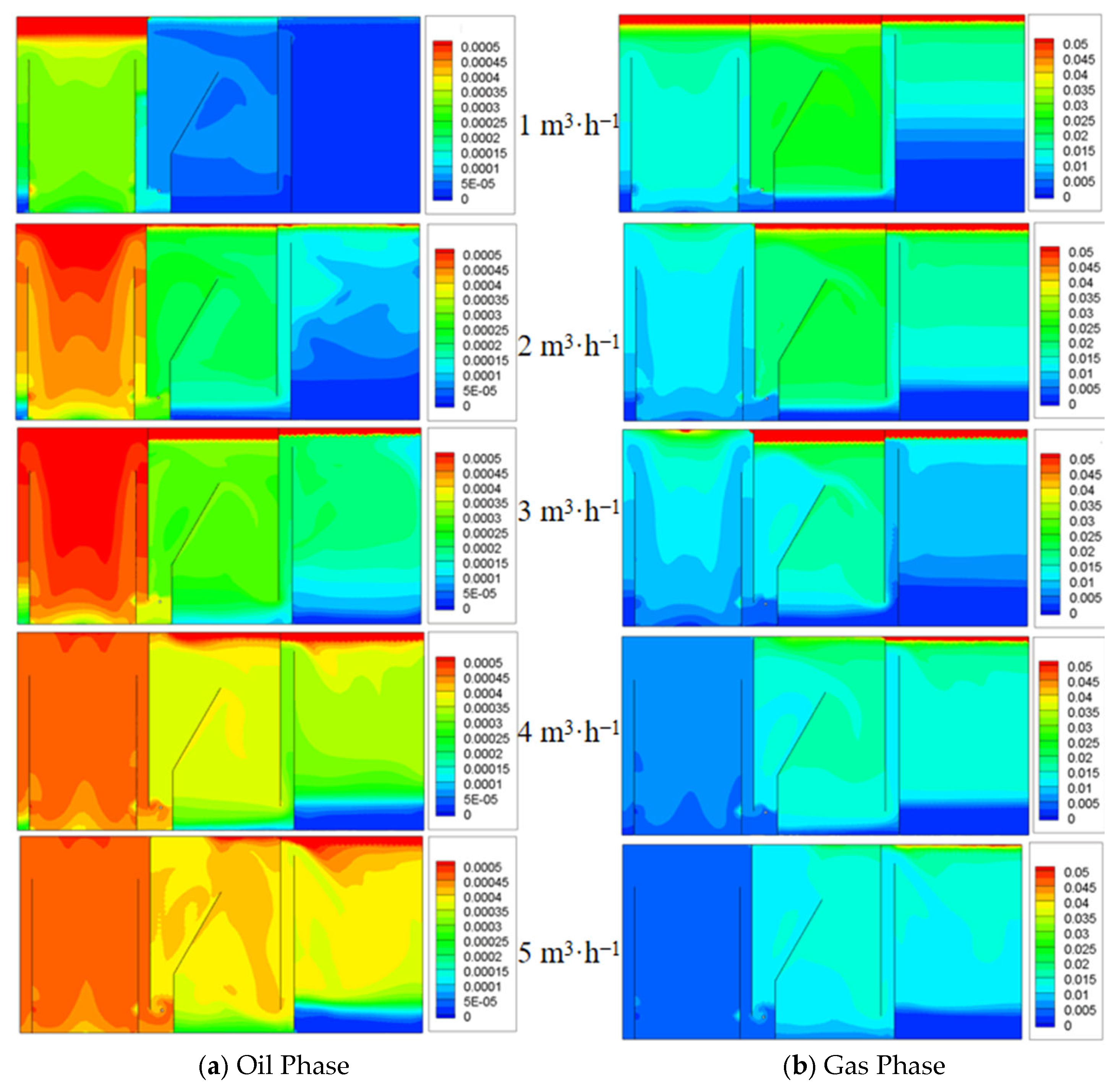 - Oil removal efficiency increases with increasing inlet gas holdup. Within the simulated range, the maximum oil–water separation efficiency occurs at a gas–oil ratio of 0.09, which is close to the optimal gas–oil ratio of 0.1 for the flotation zone.