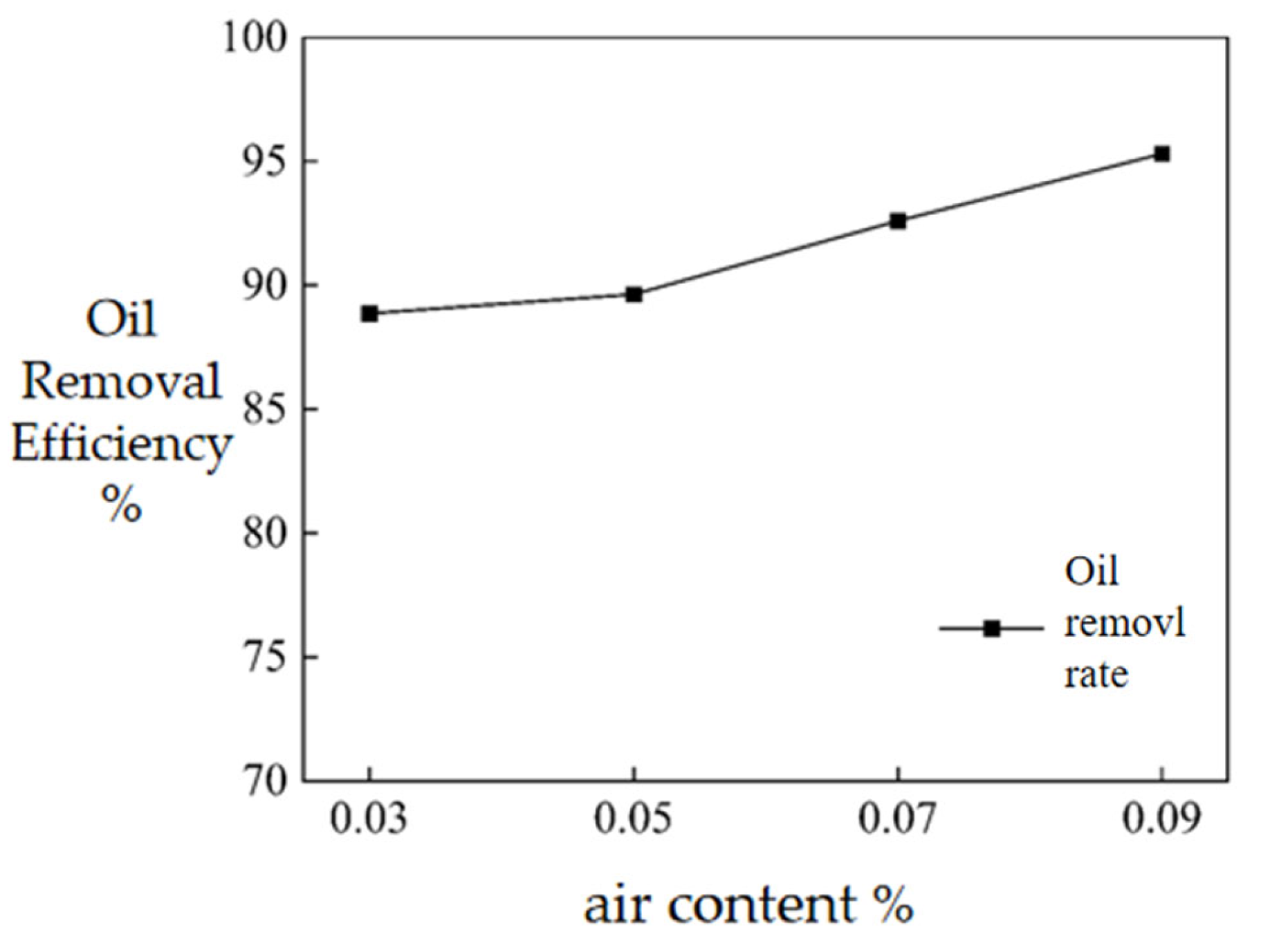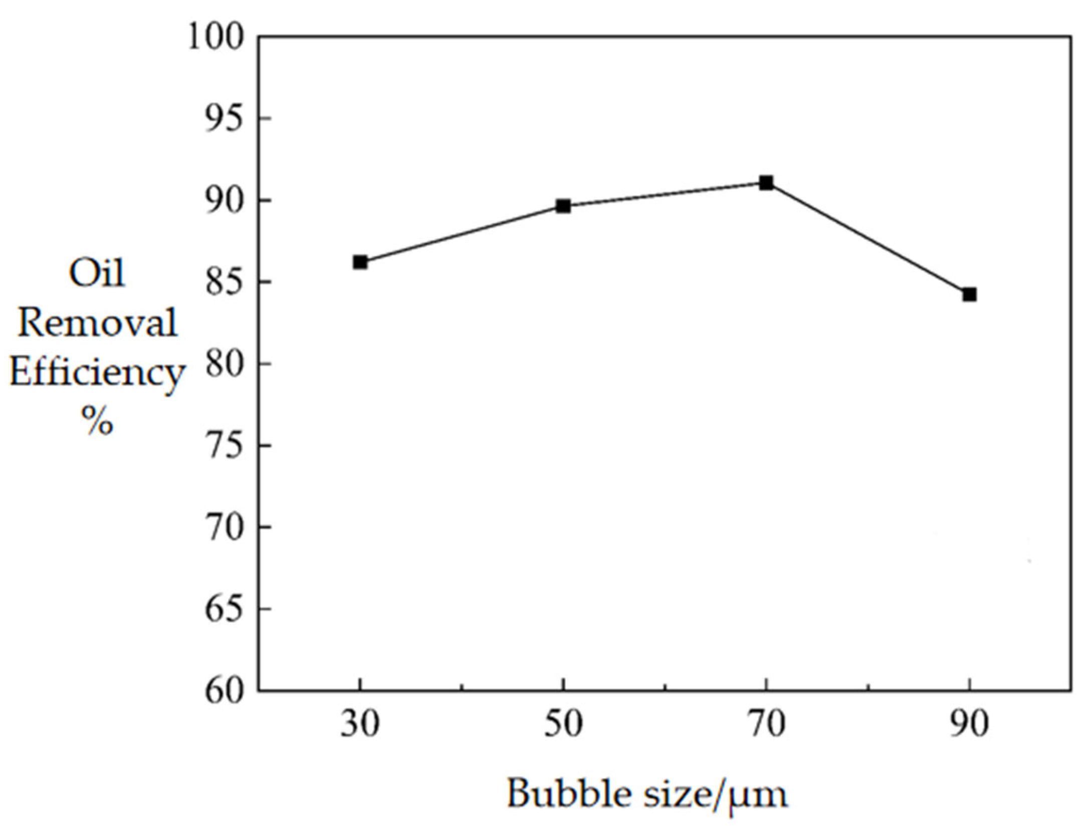 - Oil removal efficiency first increases and then decreases with increasing bubble diameter, with the highest oil–water separation efficiency achieved at a bubble diameter of 70 μm.