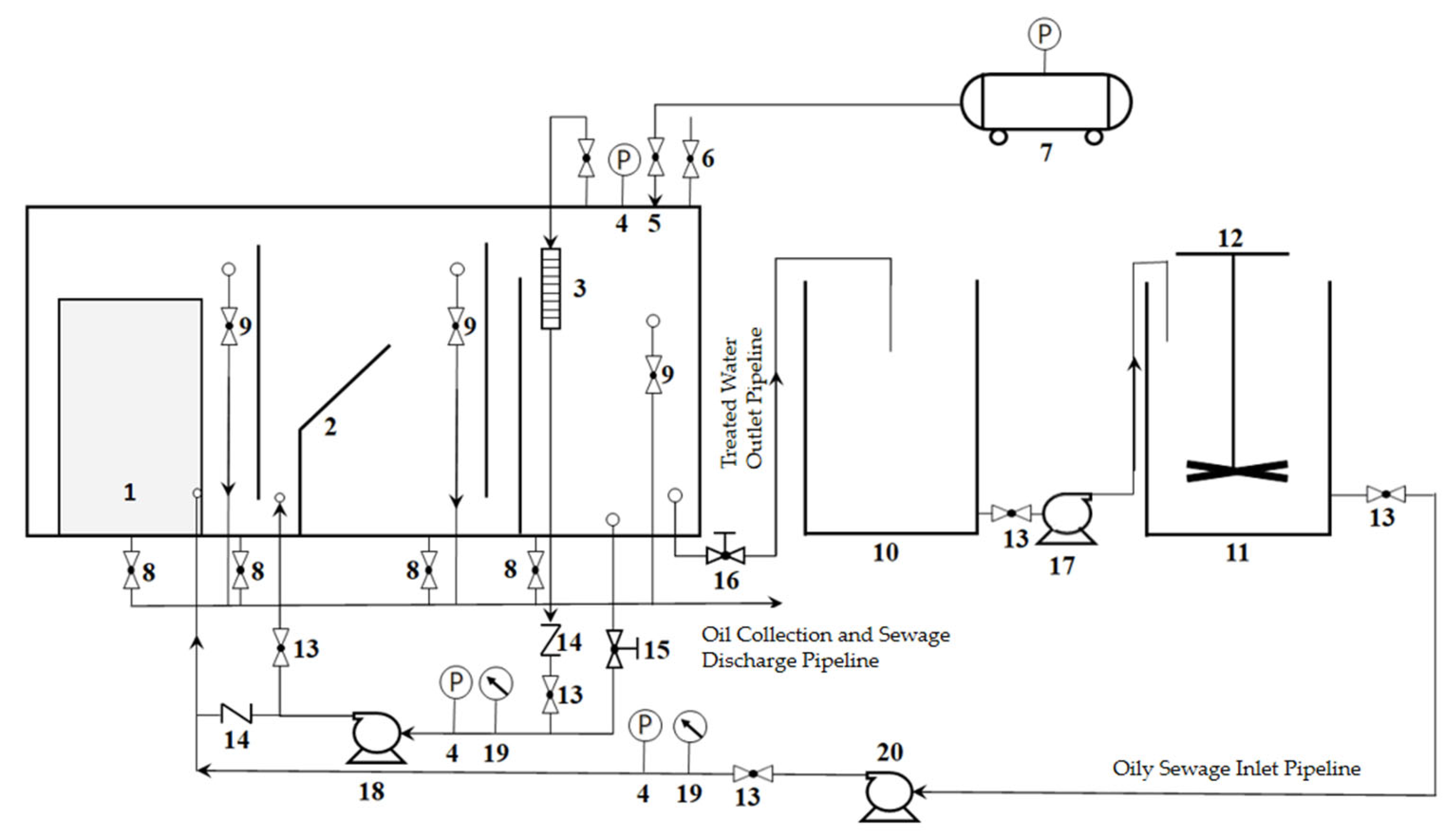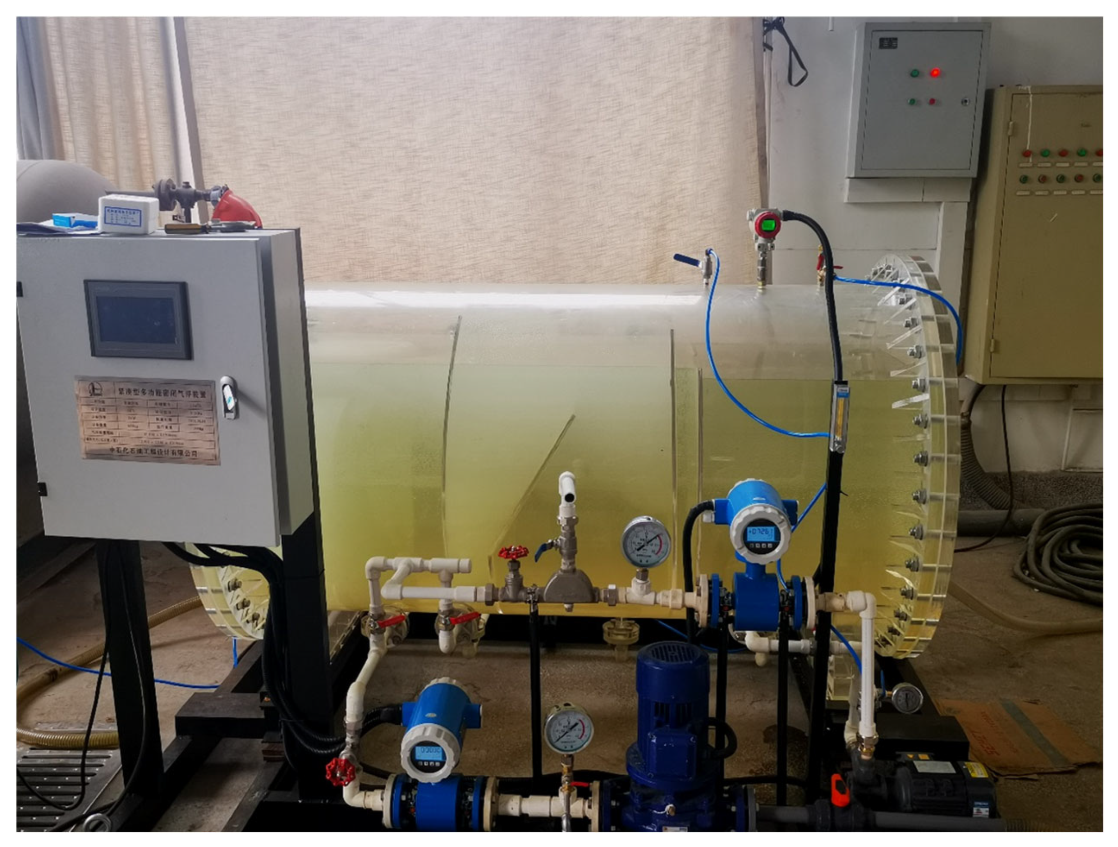 - Su, K. Experimental Research on Bubble Distribution and Performance of Swage Oil Removal in Closed Flotation Device; China University of Petroleum: Qingdao, China, 2018. [Google Scholar]