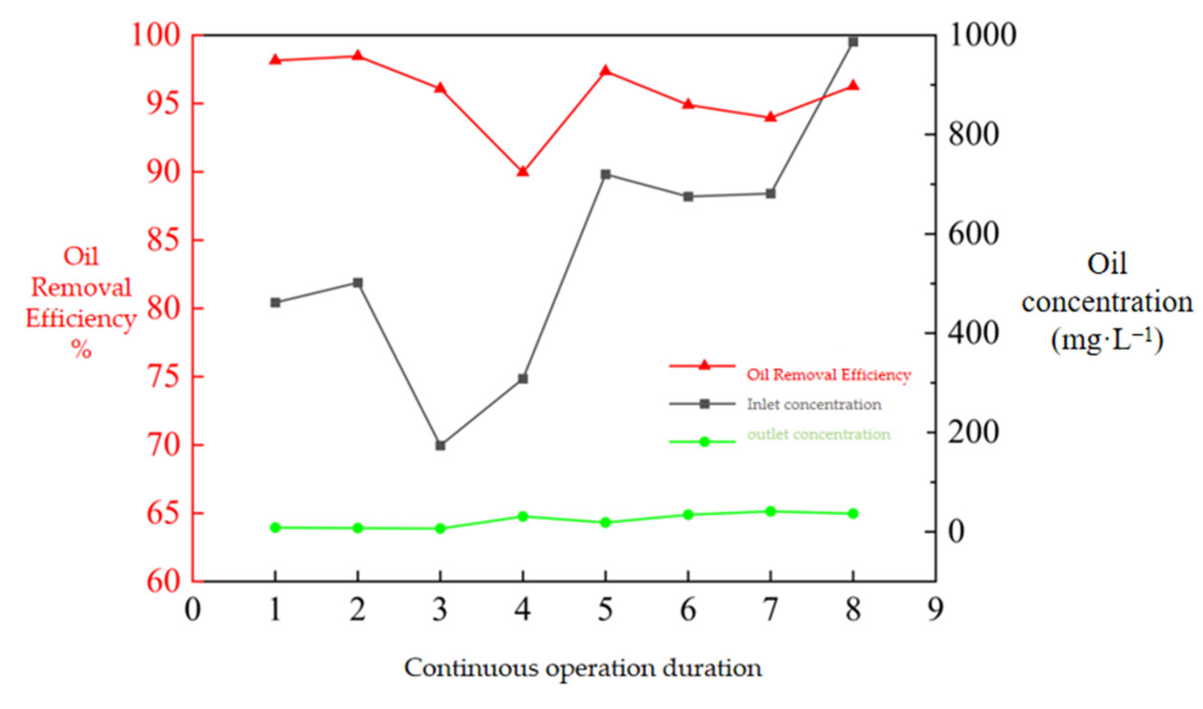 5.3. Influence of Inlet Parameters on Oil Removal Efficiency
