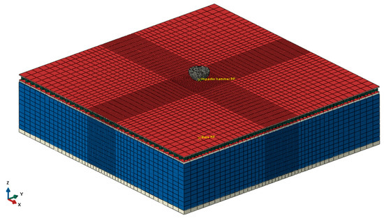 Finite element calculations were used to study the impact behavior of an asymmetrical sandwich protection plate with a fiber composite laminate, a metal sheet, and a metal honeycomb core. The detailed finite element model is shown in Figure 2. The finite element model of the protection plate is constructed in the Abaqus 2018 standard, and each layer of the protection plate is constructed using the shell element S4R, because the shell elements have high computational efficiency in handling thin-walled structures and at the same time can accurately represent the anisotropic properties of the material. The soft supports were built using the solid element C3D8R. The hammer head is modeled as a rigid model with a concentrated point mass and a predefined velocity, while appropriate mesh refinement was performed at the point of impact. The enhanced stiffness relaxation method is used to prevent hourglassing of the reduced integration elements. The dimensions of the finite element model protective plate are the same as those described in the experimental setup [21]. The nodes in the peripheral area of the uppermost PP/GF and the bottom surface of the soft support are fixed, while the impactor is assigned an initial velocity (for instance, 7.303 m/s for 400 J impact energy) in the vertical direction. General contact is used globally, with a penalty friction formula to account for friction, and a friction coefficient of 0.15 at contact points. Adhesive contact is used between the protective plate layers, while the protection plate uses cohesive contact between the layers. The numerical process of finite element calculation is shown in Figure 3 and the specific dimensions and model parameters of each layer are detailed in Table 1. In Table 1, “E” represents Young’s modulus, and “v” represents Poisson’s ratio.
