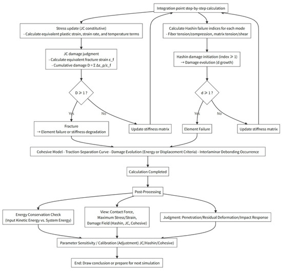 The finite element approach adopted in this study couples lamina-level constitutive modeling with Hashin damage for the PP/GF layers, and Johnson–Cook plasticity and failure criteria for the metal layers; layer interfaces are modeled via cohesive/contact formulations. This combination was chosen because (1) the problem involves large-deformation contact and progressive damage (delamination, matrix cracking, ductile metal plasticity), for which explicit dynamics solvers (Abaqus/Explicit) efficiently handle severe contact nonlinearity and element deletion without the convergence issues typical of implicit solvers; (2) Johnson–Cook captures the strain rate sensitivity and cumulative damage effects of metallic faces in impact loading; and (3) Hashin’s criteria are widely used for ply-level composite failure prediction.