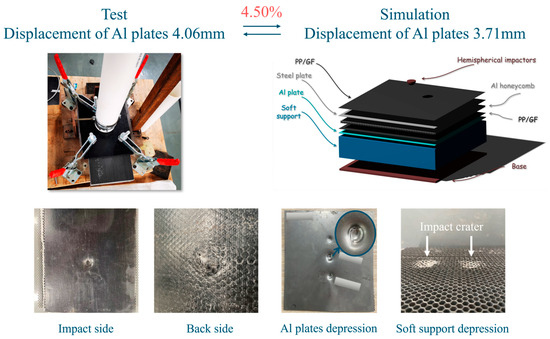 The damage mechanism of the sandwich composite panels under impact conditions is a complex process, involving a variety of phenomena such as matrix cracking, surface buckling, delamination, fiber shear, and fiber fracture. These different modes of injury often interact with and influence each other, resulting in a complex injury process. Figure 4 shows the observed impact performance under benchmark conditions for shock testing on the protection plate, demonstrating direct evidence of this complexity. In particular, the displacement of the aluminum plate reached 4.06 mm under the impact energy condition of 400 J, while the displacement of the aluminum plate obtained by simulation was 3.71 mm, which indicates that the relative deviation between the simulation results and the test data was only 4.50%. This high degree of consistency verifies the validity and accuracy of the finite element model, indicating that the finite element model has a high reference value in predicting the response behavior of materials under actual impact conditions.