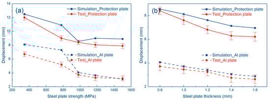 The impact performance of steel plate on the protection plate is tested and simulated: (a) the strength of the steel plate is used as a variable; (b) the thickness of the steel plate is used as a variable.