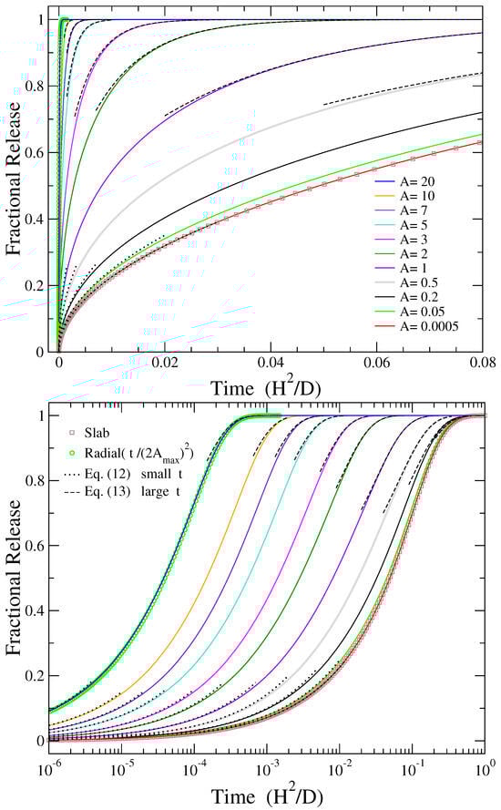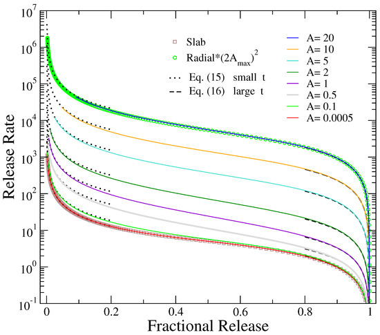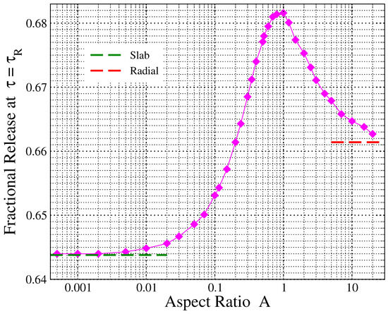 For comparison with the two extreme values of A presented in this plot ( and ), the limiting cases of release from a slab, provided by Equation (6), and radial release from a disc, as provided by Equation (9) while taking into account the scaling of the independent variable by as indicated in Equation (11), are also depicted by open squares and circles, respectively. As can be seen from Figure 1, the release from slab (radial release) coincides with that obtained for the smaller (larger) value of the aspect ratio considered in this work.