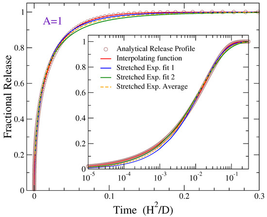 Figure 3 shows a representative fitting. The exact result of Equation (4) for is depicted by open circles, while the continuous lines are fittings with Equations (17) and (18). The inset shows the same plot in logarithmic time scale in order to access the initial part of release, which is not distinguished in the main graph. The fitting with the interpolating formula (red curve) is very robust, contrary to the stretched exponential function where the stretched exponent b is sensitive to the fitted data points of fractional release. This sensitivity of parameter b has been already noted in earlier studies [32,59]. For this reason, two different fittings are presented in Figure 3 regarding the Weibull fit: The blue and green curves are obtained when the fitting emphasizes more the longer- or shorter-time data points, respectively. The dashed orange curve provides a compromise of this situation, corresponding to the average values of the fitting parameters obtained in the latter two cases. The emphasis of the blue and green curves on different stages of release can be clearly seen from the different stretched exponential fittings in the figure.