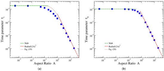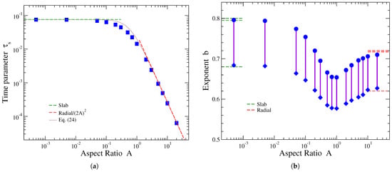The dimensionless time parameter exhibits a monotonous decrease with the aspect ratio A, similarly to the behaviors of and presented in the previous subsection. In the limiting cases of release from slabs and radial release from disks, the corresponding fitting values of this parameter are [31,41] and [31,35], respectively. These results mean that for , the is expected to tend to the constant value 0.076, shown by the horizontal green dashed line in Figure 5a, while for , parameter should behave as , represented by red dashed line in this plot. We see from Figure 5a that these limits are nicely reproduced by the fitting parameter values. Interpolating between these limiting behaviors yields