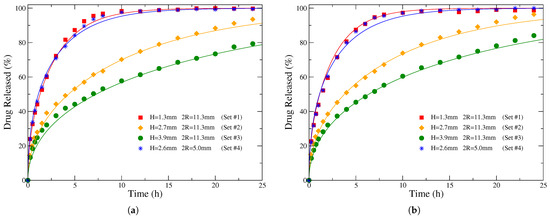 In the first three sets, the initial drug loading was 20%, the initial diameter of the matrices was mm, and the heights H of the cylindrical tablets were 1.3, 2.7, and 3.9 mm, respectively. The obtained release profiles in the two different solutions are presented in the (a) and (b) plots, respectively, of Figure 6 (for mm) and Figure 9 (for and 3.9 mm) in Ref. [60]. Regarding the fourth set, the initial dimensions of the carrier were mm and mm, while the initial drug loading was 40%. The corresponding release data are depicted in Figure 8 (a) and (b) of that paper for the solvent 0.1 M HCl and phosphate buffer pH 7.4, respectively [60].