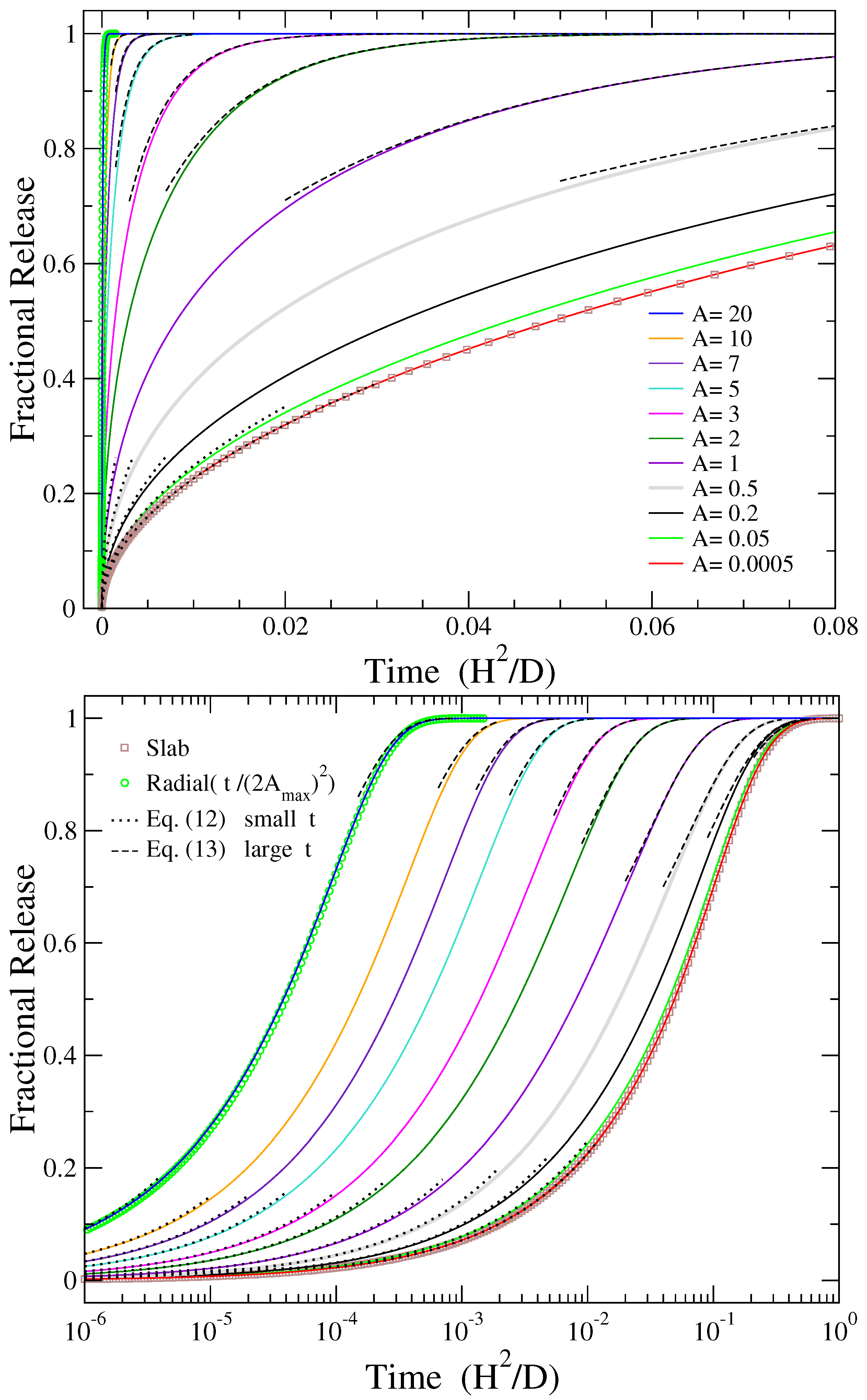 - Long cylindrical rods, where the cylinder’s height is much larger than its radius ( or ). In this case, the release from the two circular bases can be ignored since the drug molecules exit mainly through the much larger boundary area of the lateral surface of the cylinder. Then, Equation (1) ends up being the result of a two-dimensional radial release from a disc of radius R [33]:Here, the natural dimensionless time isand the resulting fractional release of Equation (7), which does not depend on any parameter, isHowever, in order to compare this limiting case with the general description of cylindrical release discussed in this work, we consider the dimensionless time of Equation (3), and then Equation (7) yields the A-dependent formulaThe last two equations are connected through the transformation of their independent variables