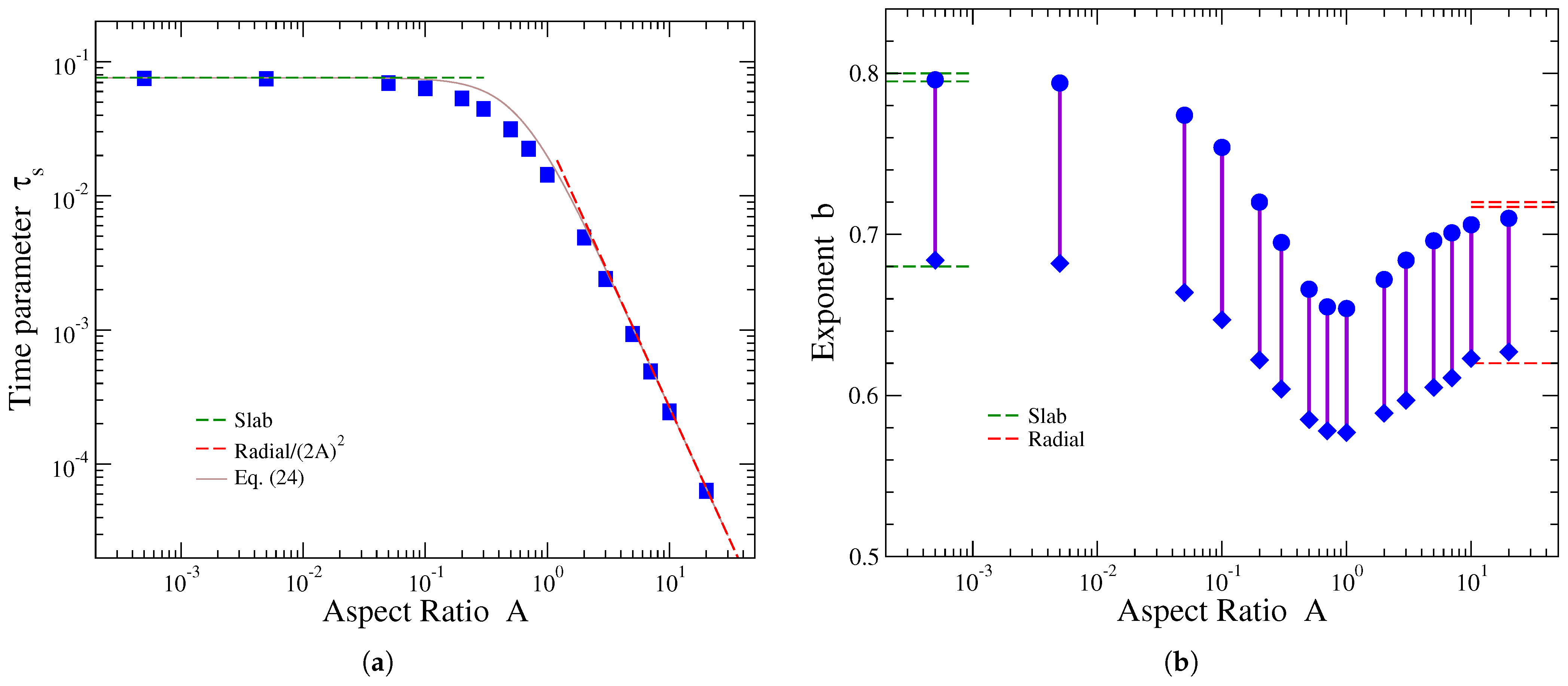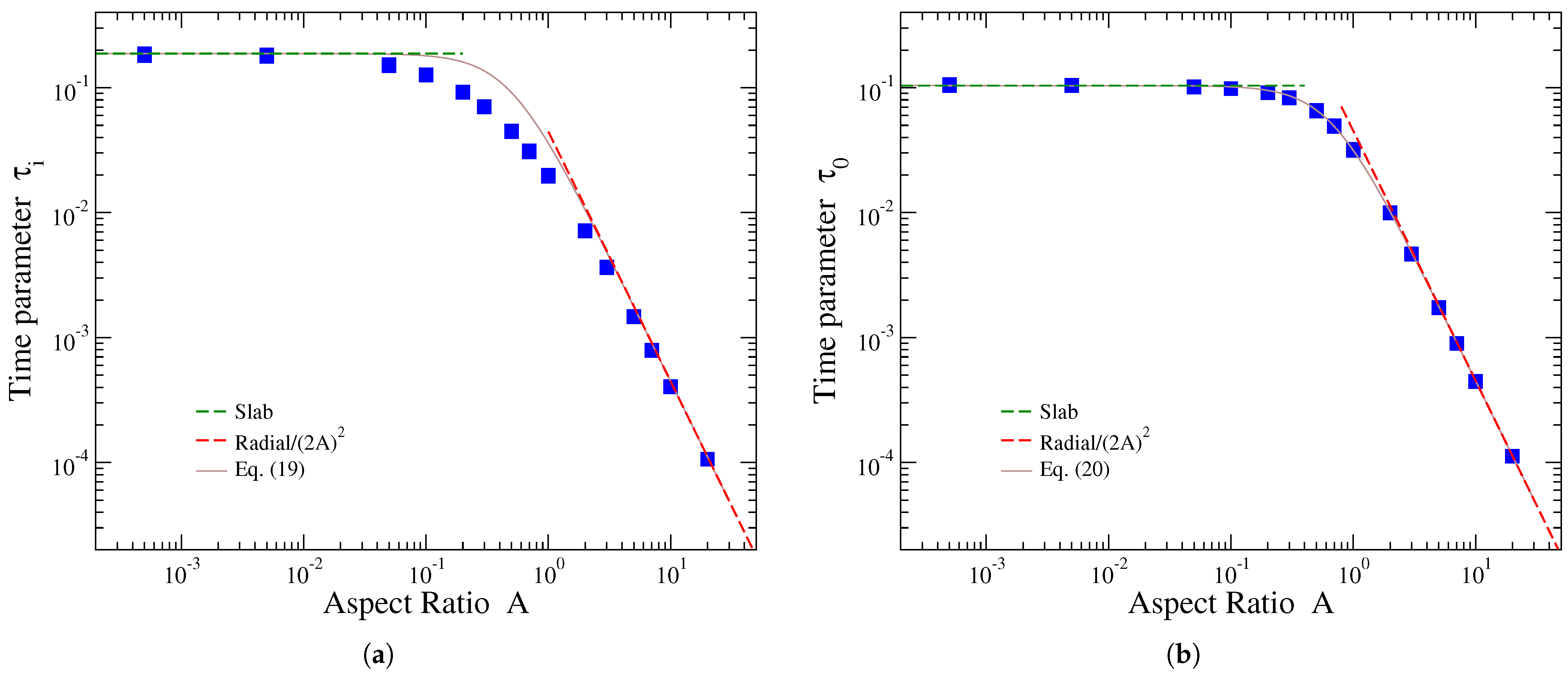 - Calculation ofThe dimensionless characteristic release time can be directly computed using Equation (28) for the given value of aspect ratio A. If such a calculation is not convenient, the can be alternatively obtained through the plot of Figure 2 of Ref. [47]. For , the dimensionless release time can be approximated by its corresponding value for thin slabs, , while for , it can be approximated by the two-dimensional radial release expression . A simple relation interpolating between these two limits can provide an approximation of the dependence of on the aspect ratio:If the aspect ratio lies in the region , then this formula would give a rough estimate of , overestimating its actual value. For a comparison of this simple approximating expression with the exact result of Equation (28), as well as the dependence of their difference on A, see Figure 2 of Ref. [47].