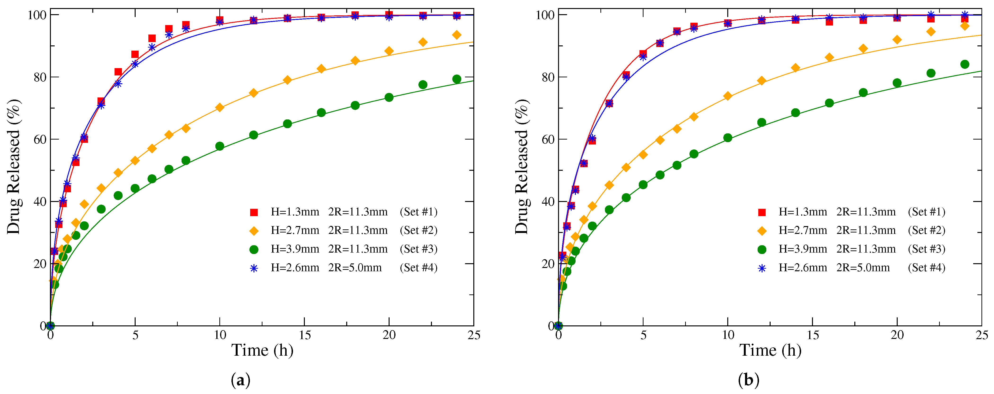 - Flat disks, where the height of the cylinder is significantly smaller than its radius ( or ). In this situation, the release from cylinder’s lateral surface can be ignored, as it is substantially smaller compared to the release from the two circular bases, which exhibit a much larger area for the escape of drug molecules. Then, Equation (1) reduces to the corresponding result describing release from a thin slab of thickness H [33]: