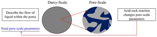 This section presents a mathematical framework for simulating reactive acid transport and dissolution processes in carbonate reservoirs at the darcy and pore scales, with particular emphasis on matrix acidizing mechanisms. By adapting the conceptual basis of equivalent continuum approaches, the model formulates coupled flow, solute transport, and chemical reaction equations at the darcy scale, while incorporating pore-scale evolution laws to capture changes in porosity and permeability due to acid–rock interactions, as shown in Figure 1. Additionally, a heat transfer model is integrated to account for thermal variations in both the solid matrix and the fluid phase during the acidization process. The overall system consists of Darcy-scale equations governing fluid flow and acid transport in the porous matrix, pore-scale relationships describing the evolution of rock properties, and energy balance equations for the matrix domain—specifically including equations for acid concentration and rock/fluid temperature dynamics.