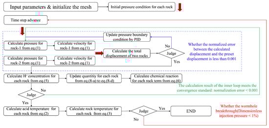 In this section, we present the simulation strategy of the multi-layered rock acidizing problem. All equations and mathematical models mentioned in Section 2 are embedded in the open-source simulation framework FMOT (https://github.com/FMOTs/FMOT_matlab, accessed on 2 October 2025) [,].