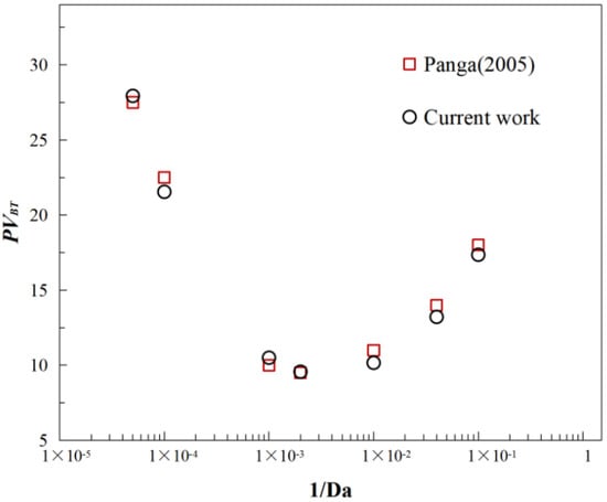 To validate the accuracy of the model developed in this study, its computational results are compared with those of the two-scale continuum model proposed by Panga []. The simulation domain is a two-dimensional homogeneous porous medium with dimensions of 0.05 m in length and 0.02 m in width. Acid is injected at a constant rate from the left boundary, with flow exiting on the right boundary, while the top and bottom boundaries are set as impermeable. Wormhole breakthrough is defined as the moment when the injection pressure drops to 1% of its initial value []. The Damköhler number () is introduced, defined as , is the acid injection rate; L is the length of the model.
