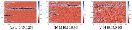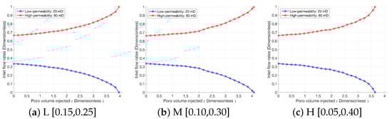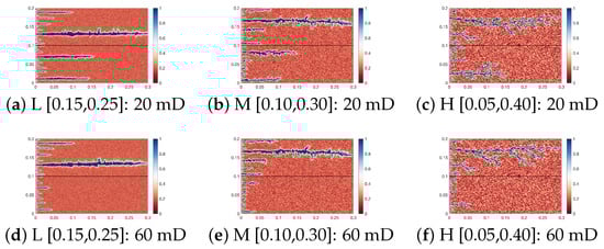 In this study, the porosity distribution is obtained by generating normally distributed random numbers, with a mean value of 0.2. The amplitude of porosity fluctuation is used to characterize the heterogeneity intensity of porosity, and this heterogeneity intensity is classified into three levels (low (L), medium (M), and high (H)). Specifically, the fluctuation amplitude ranges corresponding to low, medium, and high heterogeneity intensities are [−5, 5], [−10, 10], and [−15, 20], respectively, and the resulting porosity value intervals generated thereby are [0.15, 0.25], [0.10, 0.30], and [0.05, 0.40] in sequence. Figure 5 shows the porosity distributions corresponding to the three levels of heterogeneity intensity used in this study, where the upper layer is a high-permeability rock and the lower layer is a low-permeability rock. These two rock layers (upper and lower) exhibits the same level of the heterogeneity intensity. Further, permeability is calculated from porosity using the Carman–Kozeny equation, which is given as follows: