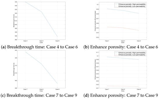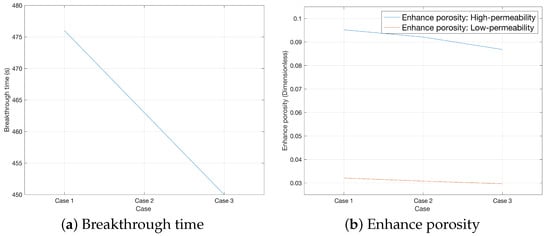 Conversely, when the interlayer permeability difference increases from 40 mD to 60 mD, the acid breakthrough times of rocks under three heterogeneity intensities decrease from [476 s, 463 s, 450 s] to [424 s, 416 s, 403 s], as shown in Figure 11c. At this time, the increase in the proportion of acid flow allocated to high-permeability rocks accelerates the acid–rock reaction rate, thereby speeding up the acid breakthrough of the rocks. Porosity increment data show that the porosity increment of low-permeability rocks decreases significantly from [0.0321, 0.0308, 0.0297] to [0.0161, 0.0157, 0.0144], while that of high-permeability rocks increases from [0.0952, 0.0921, 0.0868] to [0.0974, 0.0938, 0.0900], as shown in Figure 11d. It can be seen that the increase in interlayer permeability difference almost completely inhibits the acidizing effect inside low-permeability rocks.