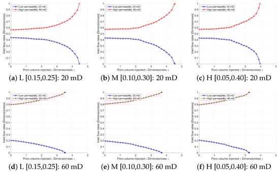 Figure 10 illustrates the results of the comparison of flow diversion. When the interlayer permeability difference is 20 mD, the inhibitory effect of the high-permeability rock on the low-permeability rock weakens, and the initial flow distribution of the low-permeability rock increases from 0.34 (at 60 mD) to 0.44. When the interlayer permeability difference is 60 mD, the flow distribution of the low-permeability rock is significantly inhibited by the high-permeability rock, with its initial flow distribution decreasing to 0.2. Furthermore, the slope of the flow distribution change curve of the low-permeability rock increases with the increase in the interlayer permeability difference; at lower interlayer permeability differences, the decreasing trend of its flow distribution transforms into an approximately linear one. In addition, a larger interlayer permeability difference leads to a higher H+ concentration in the high-permeability rock, and the acid–rock reaction rate is accelerated accordingly, resulting in faster breakthrough of the high-permeability rock. Overall, during the acidification of multi-layered rock, the influences of interlayer permeability difference and heterogeneity intensity on acidification performance are mainly reflected in the low-permeability rock: the smaller the interlayer permeability difference, the greater the influence of heterogeneity intensity on the low-permeability rock; the larger the interlayer permeability difference, the smaller the influence of heterogeneity intensity on the low-permeability rock.