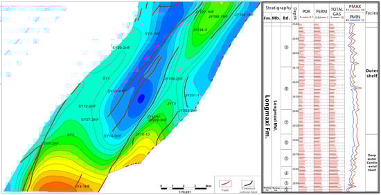 The target strata of the study area are the Upper Ordovician Wufeng Formation–Lower Silurian Longmaxi Formation, overlain by the Hanjiadian Formation of the Silurian. The thickness of the Longmaxi Formation ranges from 20 to 80 m (data source: well logs), with the lower part dominated by organic-rich black shale, which accounts for more than 50% of the total thickness and represents high-quality source rock []. Upsection, the succession gradually transitions into silty mudstone and argillaceous siltstone, with a corresponding decline in hydrocarbon generation potential. The Wufeng–Longmaxi shales are mainly dark gray to black mudstone shales, locally interbedded with silty shale. The mineralogy is dominated by quartz, feldspar, and illite, with a generally high quartz content (data source: XRD analyses). The abundance of brittle minerals is favorable for hydraulic fracturing. The total organic carbon (TOC) content is generally 2–6%, locally exceeding 8% (data source: core analysis). Overall, the depositional environment corresponds to a semi-deep to deep-water shelf under an anoxic, low-energy setting, conducive to organic matter enrichment and preservation [,,,,,]. The vertical depositional succession exhibits a shallowing-upward cycle from organic-rich shale to silty mudstone, indicating a gradual reduction in water depth and hydrocarbon generation potential