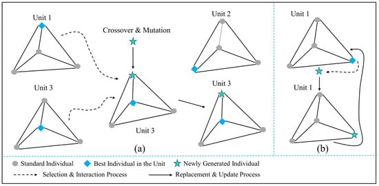 The optimization process of TBO integrates two core strategies: global aggregation and local aggregation. Global aggregation aims to maintain population diversity and conduct breadth-first searches, preventing premature convergence to local optima. This strategy selects the best-performing individuals from different units and generates new candidates through crossover and mutation. The new candidates are then compared with existing unit members, and superior individuals replace weaker ones, thereby updating the unit. Such cross-unit information exchange ensures continuous exploration of uncharted regions in the search space (Figure 3a). In contrast, local aggregation complements global aggregation by focusing on intensive exploitation of promising regions to improve convergence accuracy. This strategy identifies the best individual within a unit as the local search center and generates neighboring candidates by applying small perturbations. If a new solution outperforms the current best, it replaces the original individual as the new reference point. The process iterates within the unit until no further improvement is possible, thus ensuring fine-grained optimization in key regions and avoiding suboptimal solutions (Figure 3b).