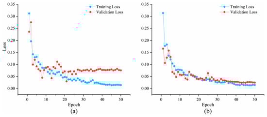 Through this systematic hyperparameter optimization process, the model fully exploited the feature representations enhanced by TBO and GAFM, achieving high-accuracy and robust sweet spot prediction. The optimal parameter configuration was determined as follows: “learning_rate” = 0.05, “max_depth” = 7, and “subsample” = 0.8. Under this configuration, the model’s performance on the test set was significantly superior to that of the unoptimized model. In the initial model, the training loss continuously decreased, while the validation loss initially declined but then plateaued or fluctuated, revealing a noticeable gap between the two (Figure 6a). This indicates overfitting in the initial model, which, although performing well on the training data, exhibited limited generalization. In contrast, the optimized model showed substantial improvement (Figure 6b). The training and validation loss curves decreased synchronously and converged at a lower level, with minimal gap between them.
