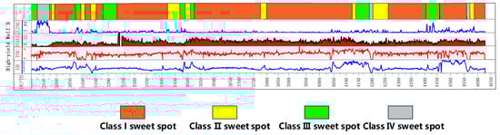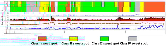 For high-production Well B, Class I and II sweet spots account for 81.88%, and Class III and IV sweet spots account for 18.11%, with a first-year daily production of 64,000 m3. The algorithm’s predicted sweet spots correspond closely with actual production, demonstrating the model’s accuracy and reliability in capturing productivity-related sweet spot distributions (Figure 9).