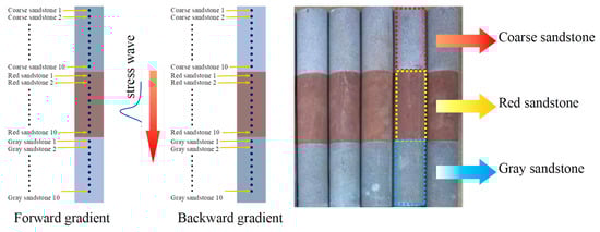The gradient composite rock mass used is shown in Figure 2. The mechanical properties of the materials are shown in Table 1. The uniaxial compressive strength of the three rock types increases gradually in a specific ratio; such a rock mass is termed a gradient composite rock mass. Individual rock specimens measured 50 mm in diameter and 131 mm in height, while the gradient composite rock specimen measured 50 mm in diameter and 400 mm in height. Arrange 30 measurement points along the central axis of the specimen, with 10 measurement points spaced at equal intervals (12 mm) for each type of sandstone. Stress waves propagating from lower to higher strength represented the forward transmission path, while the backward gradient path was defined as the opposite direction. During testing, high strain rate loading was achieved using 1.5 g, 2.75 g, and 4 g of explosives at the end points.