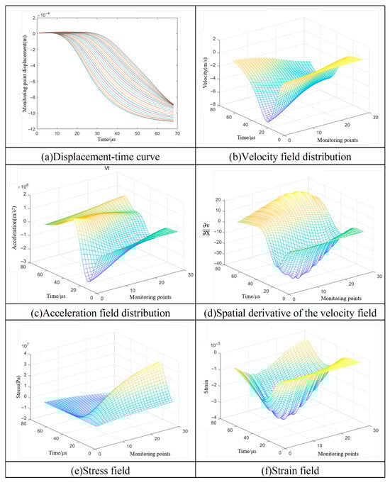 This paper employs Gaussian smoothing to correct the displacement field. The corrected displacement field data is input into a MATLAB (r2023a) program. By taking the first derivative of the smoothed displacement field, the velocity field is obtained (Figure 3b). Taking the partial derivative of the velocity field with respect to time yields the acceleration field distribution (Figure 3c). Multiplying this partial derivative result by the density and integrating along the displacement direction produces the stress field (Figure 3e). Taking the partial derivative of the velocity field with respect to spatial coordinates (Figure 3d) and integrating this partial derivative result with respect to time yields the strain field (Figure 3f).