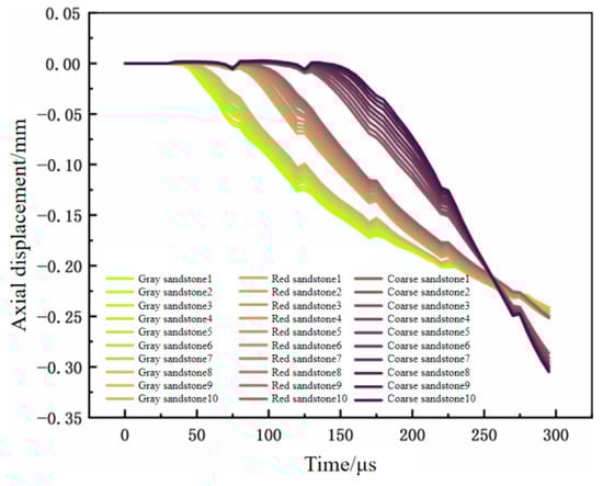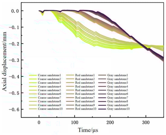 First, using a 4 g explosive charge as an example, we analyze the deformation field of a gradient composite rock mass under explosive loading. The deformation patterns of specimens under other charge quantities are fundamentally similar and will not be repeated here. Figure 4 shows the axial displacement contour map in the positive gradient rock mass. Axial displacements across the same cross-section are largely consistent, verifying that the explosive charge generates a one-dimensional explosive plane wave within the specimen. Blue indicates regions with larger displacement, while red denotes regions with smaller displacement. It is evident that the displacement field in the positively graded material changes sequentially from top to bottom. Blue regions are primarily concentrated in the upper section, and the displacement caused by the explosion diminishes as one approaches the free end. This occurs because when the explosive stress wave propagates forward, it first encounters the lower-strength coarse sandstone. This material exhibits poor deformation resistance. Simultaneously, the intense initial explosive force causes significant deformation at the upper end of the coarse sandstone. This deformation absorbs a portion of the explosive energy, thereby attenuating the transmitted energy. By the time the explosion stress wave reaches the lower gray sandstone, the stress peak has further diminished. Moreover, the higher strength of the gray sandstone provides greater resistance to deformation. The combined effect of these two factors results in a smaller displacement change at the free end.