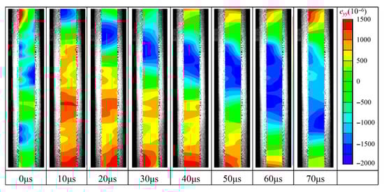 Figure 9 shows the vertical strain contour map of the backward gradient rock mass with a charge quantity of 4 g. The strain contour map effectively illustrates the propagation process of the explosive stress wave from top to bottom. During the initial stage of the explosion, localized compressive stress first forms at the end. Subsequently, under the sustained action of the explosive stress wave and blast gases, the compressive stress zone gradually propagates downward. At t = 40 μs, significant tensile strain appears at the loading end of the specimen. The tensile strain appears earlier than in the forward gradient rock mass. This is because, in the backward gradient rock mass, the sandstone first receives the impact. With a higher elastic modulus, sandstone deforms less under the same load, leading to an earlier rebound.