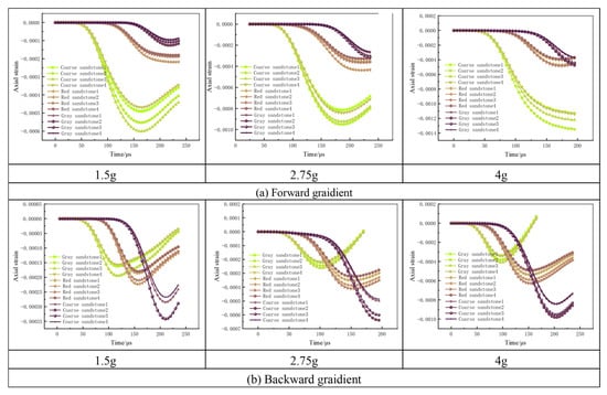 (1) As the charge quantity changes, the strain rate of the gradient composite rock mass also responds accordingly. In forward gradient rock masses, the maximum axial strains with increasing charge quantities are 0.00061, 0.00098, and 0.00141, respectively. In reverse gradient rock masses, the maximum axial strains with increasing charge quantities are 0.00036, 0.00065, and 0.00102, respectively. Coarse sandstone exhibits lower strength, resulting in faster peak strain decay under identical charge quantities; gray sandstone possesses higher strength, leading to slower peak strain decay under identical charge quantities.