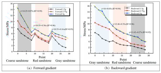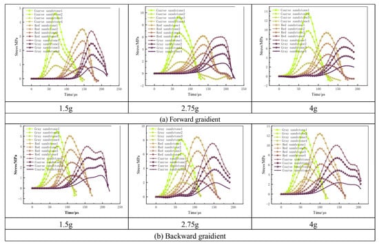 The stress–time history at the measurement point was calculated using Equation (9), as shown in Figure 11. It is evident that the larger the charge quantity, the greater the peak stress. Furthermore, the closer to the explosive end, the higher the peak stress. In coarse sandstone, the stress peak decays more rapidly, while the stress decay rates in red sandstone and gray sandstone are essentially consistent. This occurs because the explosive force attenuates with distance from the charge end, and stress wave decay is reduced at low loading rates. In backward gradient rock masses, stress decay differs from that in forward gradients: gray sandstone and red sandstone exhibit similar decay rates, while coarse sandstone shows lesser attenuation. The primary reason lies in the fact that, in the backward gradient, the explosive stress wave first encounters gray sandstone, which exhibits minimal damage and destruction, resulting in a small attenuation of the explosive stress wave. In the forward gradient, the explosive stress wave first encounters coarse sandstone, which suffers significant damage and destruction, leading to a large attenuation of the explosive stress wave.