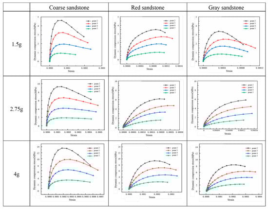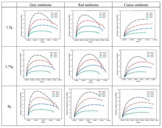 The stress–strain relationship at each measurement point in the reverse gradient is shown in Figure 14. Under different loading rates, the stress–strain curves exhibit similar patterns. As the charge quantity increases, the peak values of the dynamic stress–strain curves gradually rise. As the measurement points move further away from the explosion point, the stress peaks also gradually decrease.