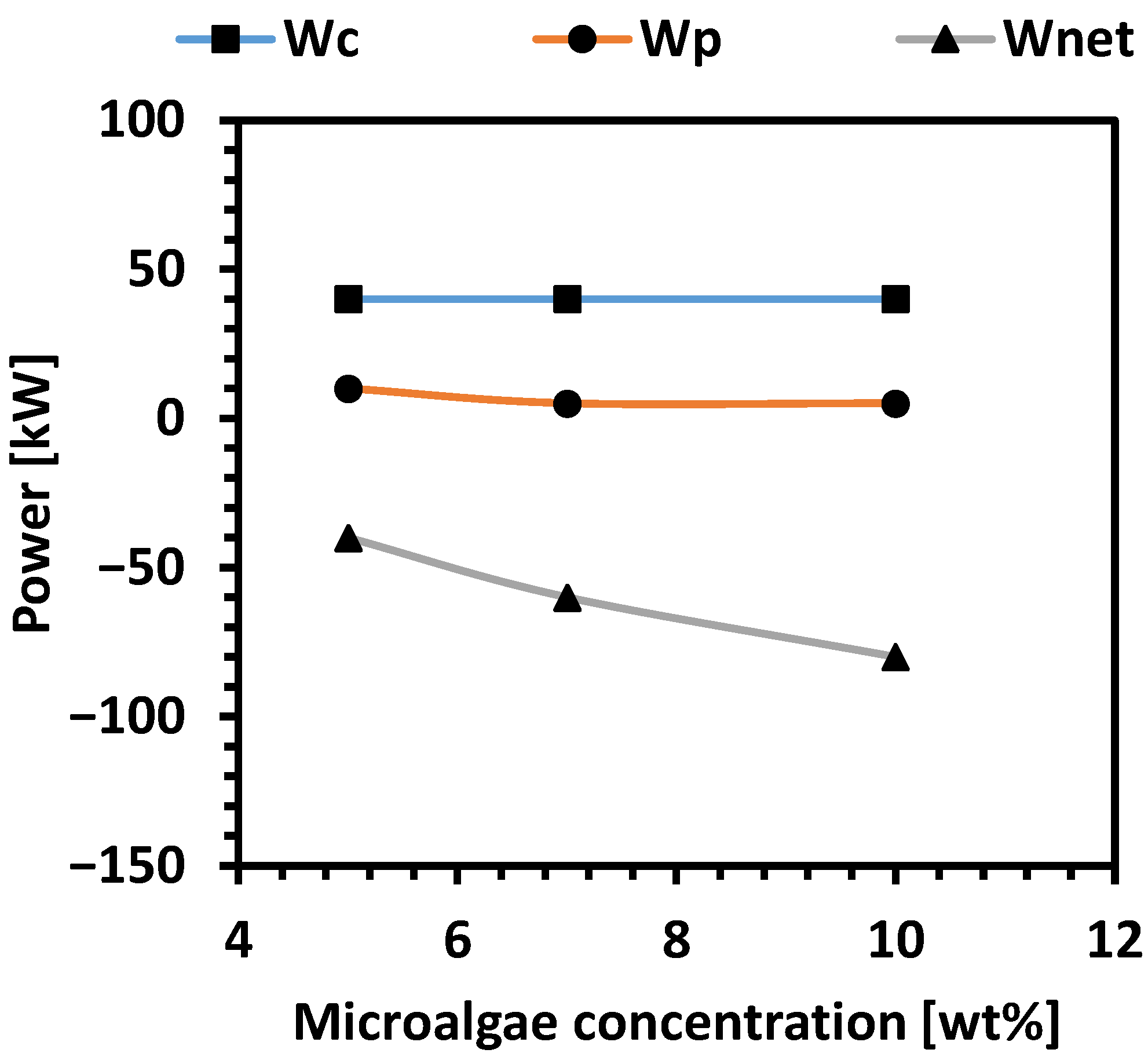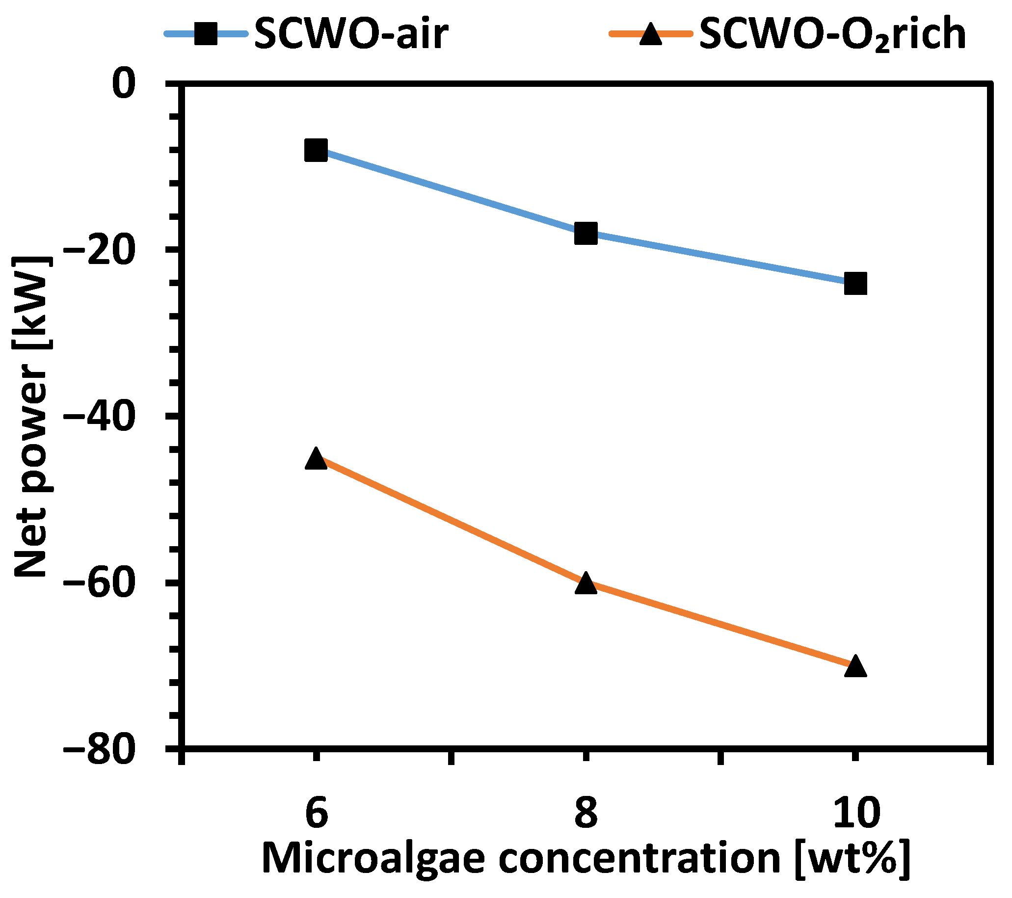 - O2-rich stream: an almost pure oxygen stream is recovered at the outlet of the vacuum pump. This oxygen can be considered a valuable co-product of microalgae cultivation, with production rates on the order of 1 kg O2 per kilogram of algal biomass. The purified oxygen stream can then be directed to the compressor for use in the SCWO process.