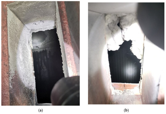 Slagging in the gas-fired boiler furnace: (a) Burner outlet and top of water-cooled walls; (b) Upper water-cooled wall peephole.