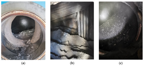Ash accumulation in the tail heating surface of the gas-fired boiler: (a) Upper convection tube bundle; (b) Mid-section convection tube bundle; (c) High-temperature economizer inlet.