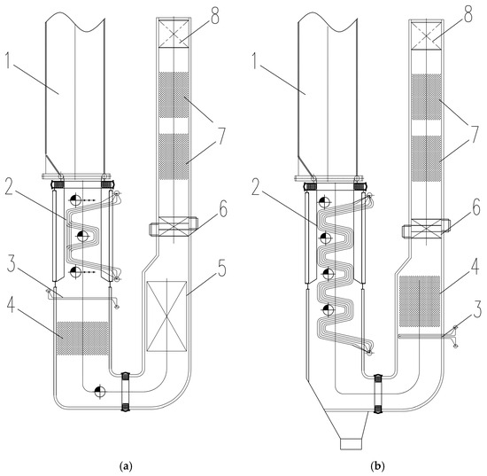 Schematic of the tail heating surfaces arrangement: (a) Pre-retrofit; (b) Post-retrofit. (1) Furnace of gas-fired steam boiler; (2) evaporative heating surface; (3) superheater; (4) high-temperature economizer; (5) former SCR location; (6) high-temperature air preheater; (7) low-temperature economizer; (8) low-temperature air preheater.