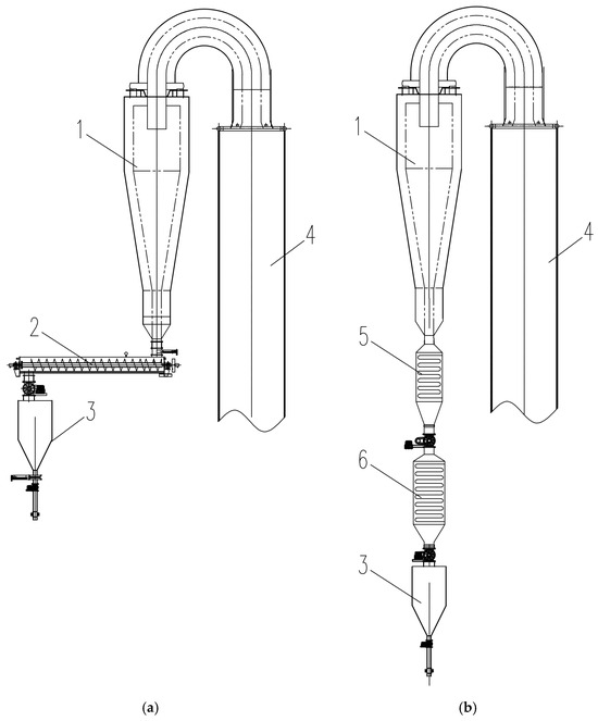 Schematic of the ash cooling system: (a) Pre-retrofit; (b) Post-retrofit. (1) Secondary cyclone separator of biomass CFB gasifier; (2) spiral ash cooler; (3) transfer silo; (4) furnace of gas-fired steam boiler; (5) primary water-cooled ash silo; (6) secondary water-cooled ash silo.