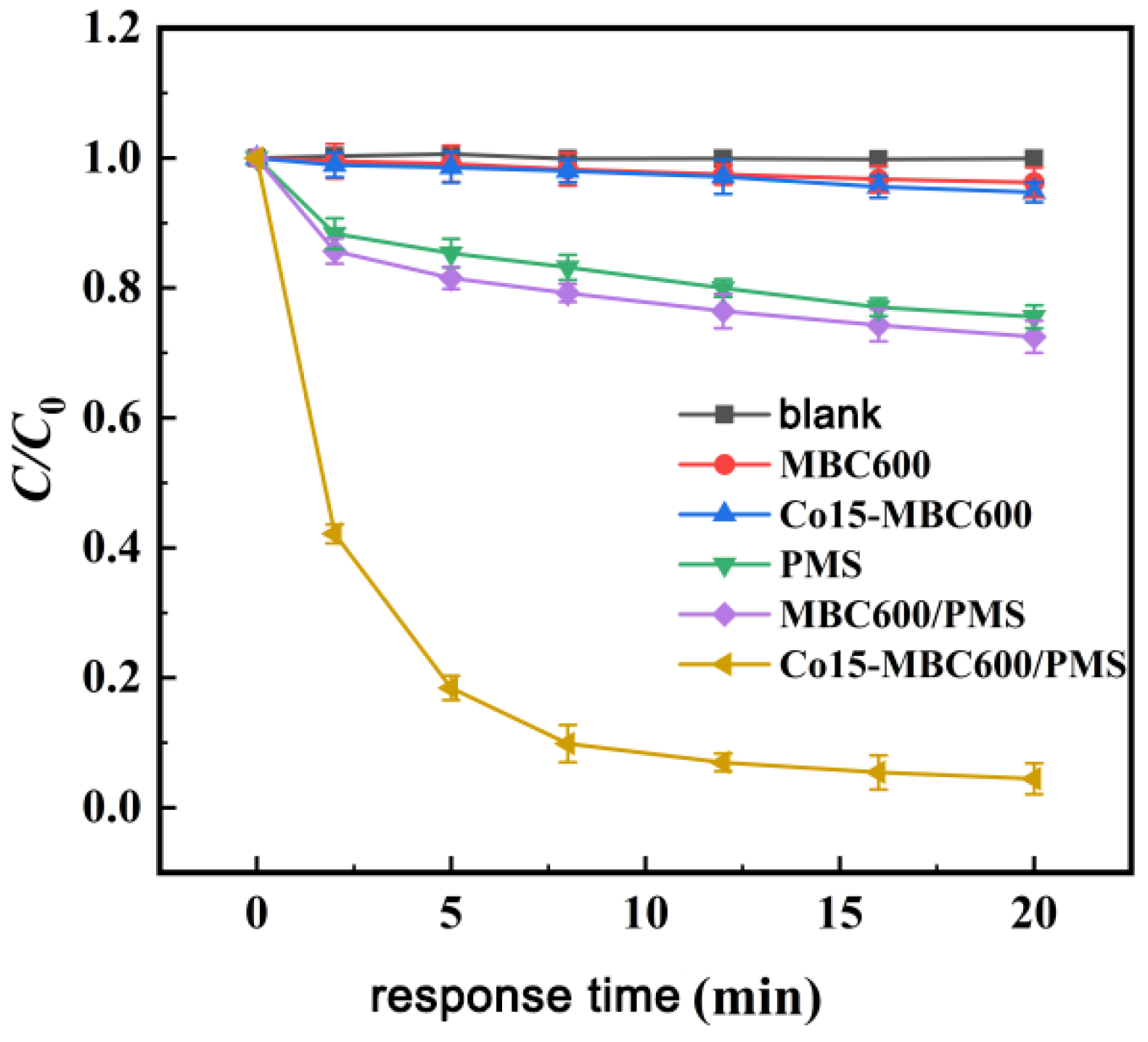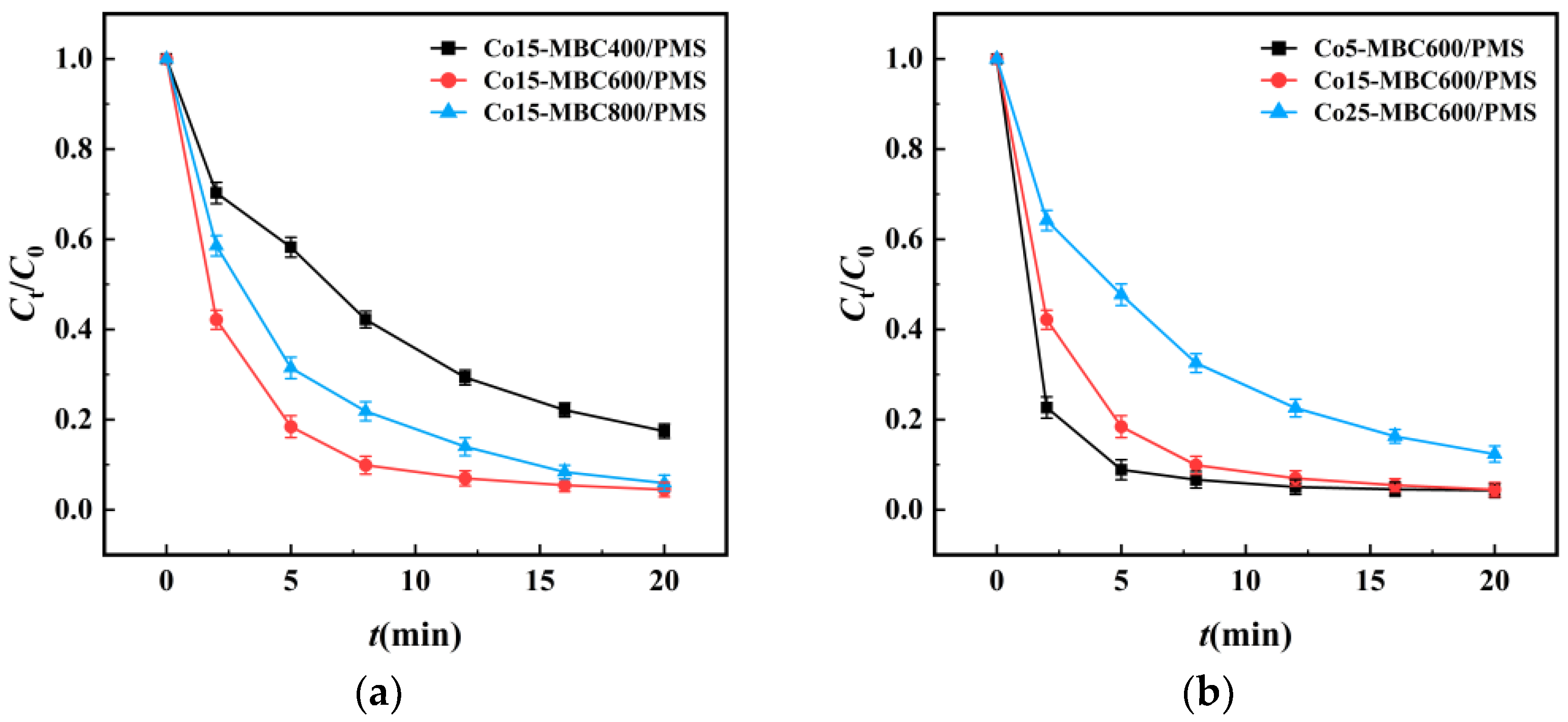 3.3.2. Influence of Co15-MBC600 and PMS Dosages