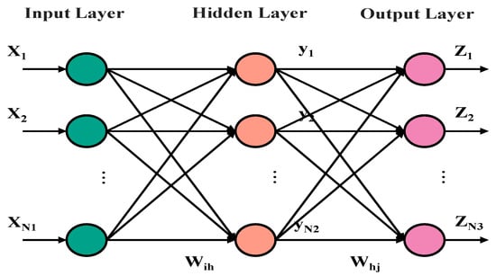 Training of a BP neural network alternates between forward propagation and backpropagation: forward propagation computes outputs layer by layer from the inputs, while backpropagation updates weights based on the error between predictions and target values to achieve learning []. For the same training set, model performance can be tuned by selecting different activation functions and parameters. The BP principle is shown in Figure 1.