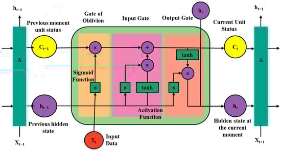 The Long Short-Term Memory (LSTM) neural network is a special form of Recurrent Neural Network (RNN). Built on the foundation of multi-layer feedforward networks, RNN achieves memory functionality by transmitting information from the previous time step through lateral connections of hidden layers and weight matrices []. Through the synergistic design of three core gating units (Forget Gate, Input Gate, Output Gate) and a Cell State, LSTM effectively addresses the vanishing gradient problem of traditional RNNs. It can accurately capture and retain key information as well as temporal dependencies in long time series, dynamically adapt to complex fluctuations of data while preserving long-term critical features, and break through the inherent limitation of RNNs that only support short-term memory, ultimately delivering more accurate and stable prediction results; The LSTM workflow is shown in Figure 4.