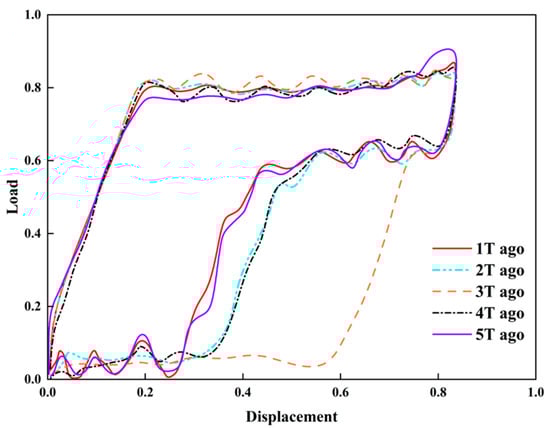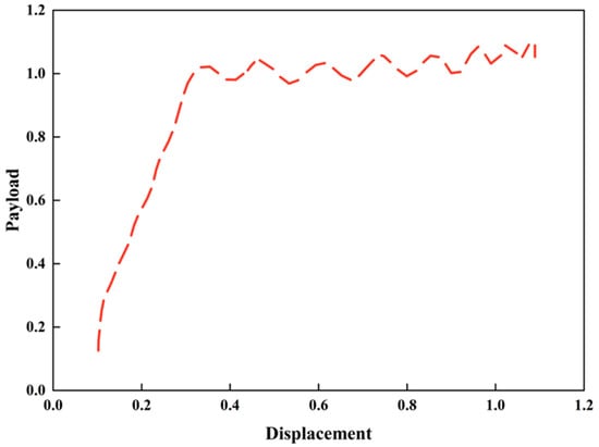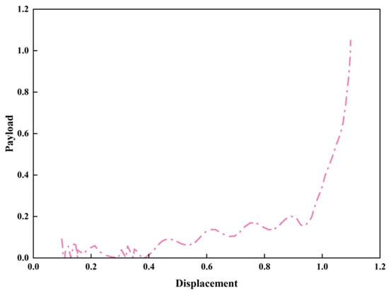 Figure 7 and Figure 8, respectively, depict the dynamic variation relationship between payload and displacement during the upstroke and downstroke processes: the upstroke curve shows a rapid upward trend of payload in the initial stage of displacement (within a small range) and then enters a fluctuating stable phase, reflecting the evolutionary characteristic of the mechanical response transitioning from drastic change to stability at this stage; the downstroke curve first exhibits slight fluctuations, and when the displacement approaches 1.0, the payload presents a sharp upward tendency, which reveals the non-linear response law of the payload-displacement during the downstroke phase. Together, these two curves clearly demonstrate the phase-dependent variation characteristics of the payload-displacement relationship throughout the full stroke, providing robust support for the dynamic response analysis of pumping units.